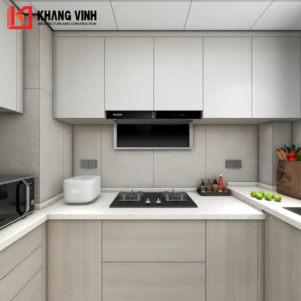 Nhà bếp được nối trực tiếp với phòng khách, với lối thiết kế đơn giản màu trắng xám tạo nên sự bình yên, thoải mái cho gia chủ khi nấu ăn. Tuy đơn giản nhưng tích hợp nhiều chức năng và sử dụng nội thất hiện đại phù hợp với sở thích nấu ăn của anh chị chủ nhà.