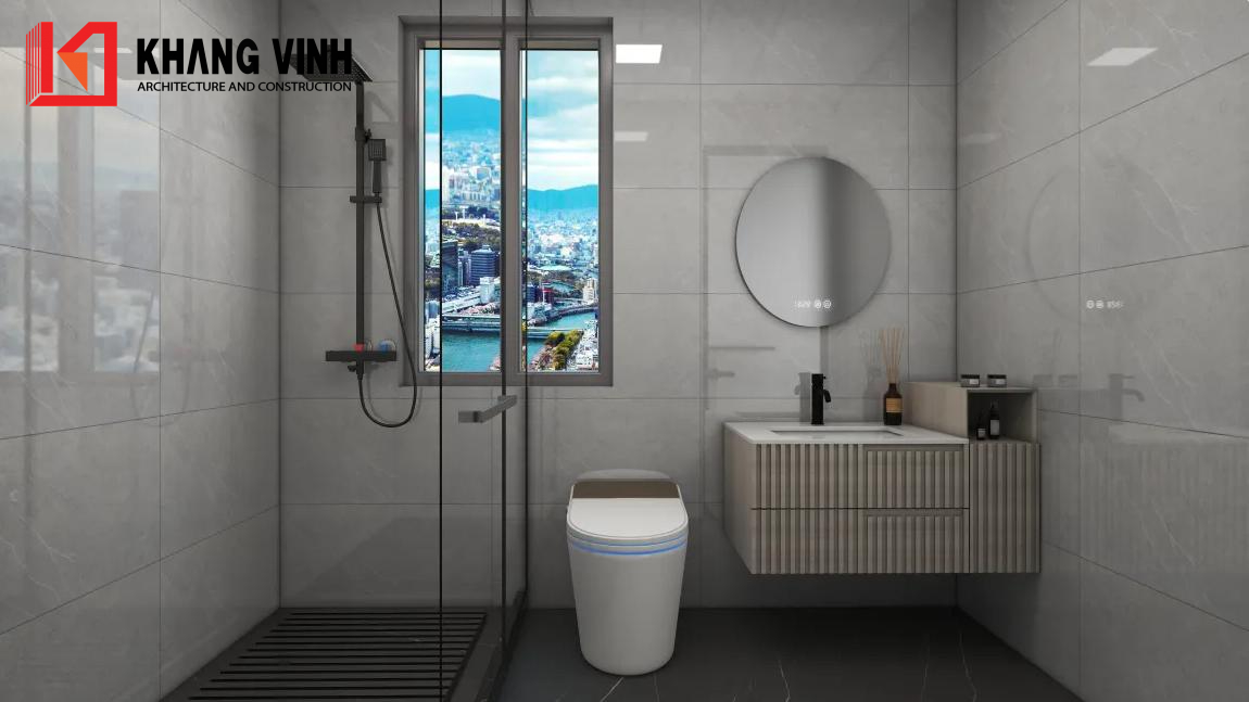Phòng tắm bé xinh được ngăn làm hai bởi tấm kính chắn. Tone màu đen xám của tường và nền thông qua gạch tạo nên cảm giác mát mẻ sạch sẽ.