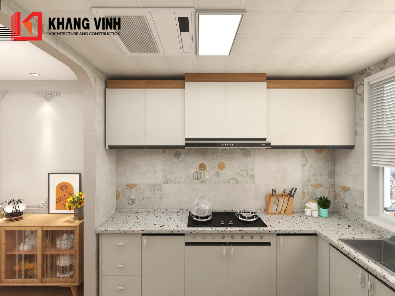 Các đường nét và hình khối chạm khắc tạo thêm nét tinh tế và sang trọng cho không gian. Thiết kế tích hợp bếp và phòng ăn giúp không gian tổng thể rộng mở hơn, đồng thời tăng cảm giác tương tác giữa các khu vực.