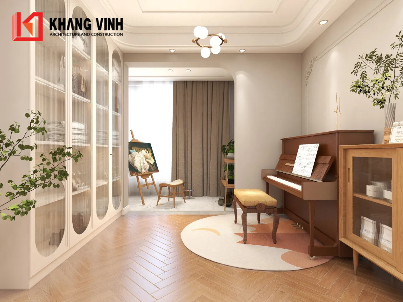 Khu vực thư giãn đáp ứng sở thích của hai bé con nhà chị Hồng. Khu vực để đàn piano và khu vực vẽ tranh được thiết kế có tủ phụ xung quanh để tăng không gian lưu trữ, trang nhã và lãng mạn.