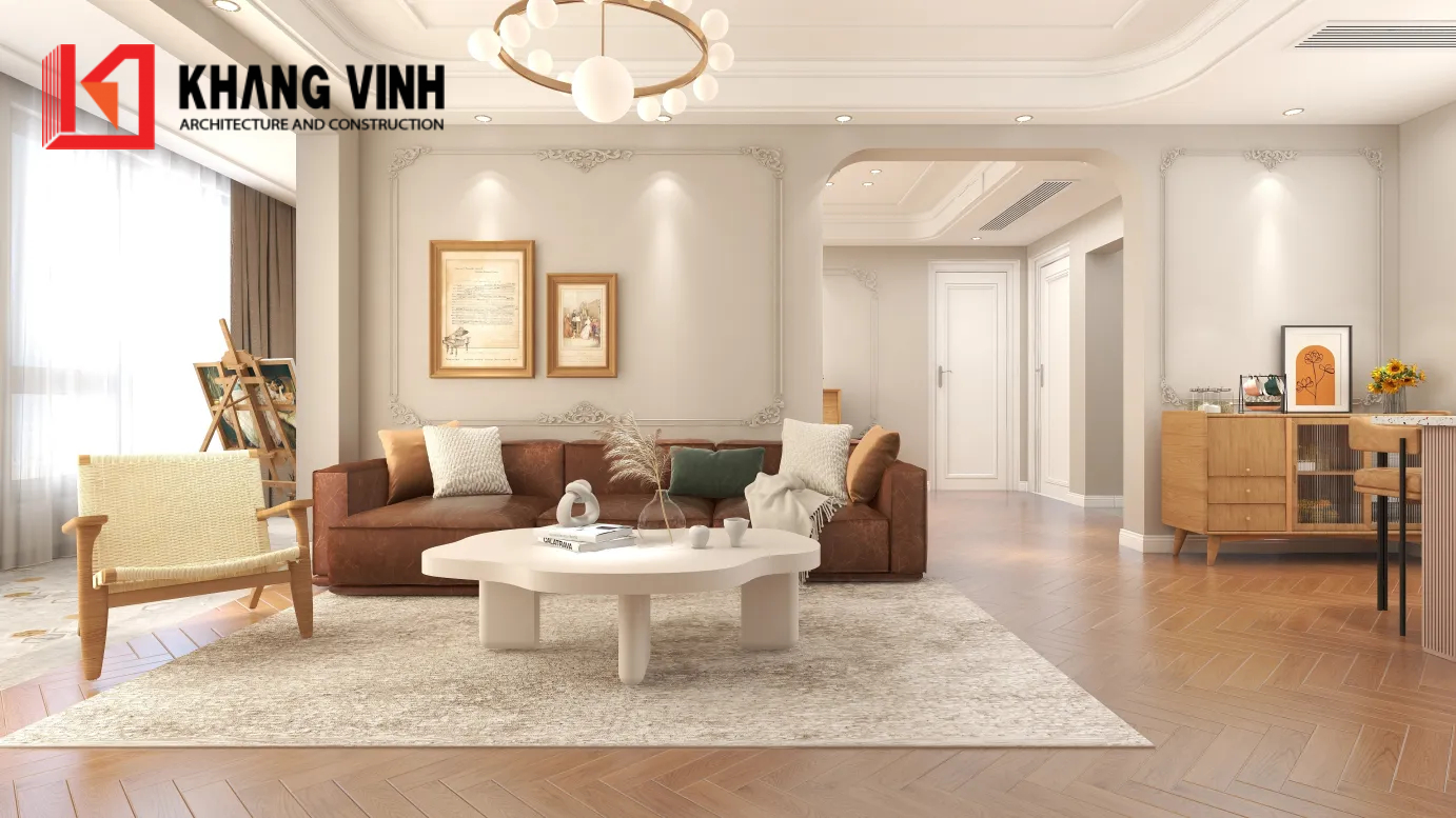Sử dụng tông màu kem kết hợp với màu gỗ ghi tạo nên tông màu caramel nhẹ nhàng. Sàn gỗ xương cá và phong cách retro bổ sung cho nhau, tạo cảm giác nhẹ nhàng và lãng mạn.